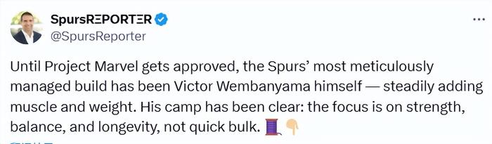 在马刺新球馆获得批准之前,马刺队管理最为精细的 “培养项目”,正是文班亚马本人 —— 通过稳步训练逐步增加他的肌肉量与体重。其团队的态度十分明确:现阶段的核心是提升力量、平衡感与生涯耐久性,而非追求快速增重。
